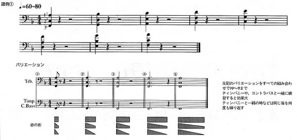 音をブレンドさせるには周りの音を聴くのが第一歩です。そして聴いた音に自分の音を合わせます。音量、音程、アタック、音の長さ、余韻、音の形など、すべて同じにします(譜例1)。基本的に1番トロンボーンに合わせるようにし、1番トロンボーンは1番トランペット、1番トランペットはコンサートマスターに合わせます。この事から各セクションの1番奏者は音の処理(長さ)、音楽の流れ、方向、和音の構成、ほかのセクションとのバランスなど考えなくてはなりません。