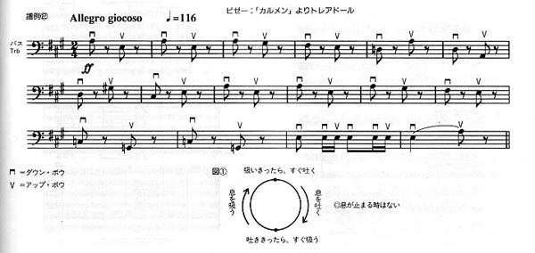 バス・トロンボーン奏者は主にファゴット、コントラバス、バスクラリネット、バリトンサックス、チューバなど低音楽器を聴くようにします。特にティンパニーを良く聴いて演奏するとバンド全体のサウンドがまとまりやすくなります。これらの楽器の音色がブレンドすると幸せな気分になります。また上級者はコントラバス(弦楽器)のボウイングを意識すると音楽の流れが良くなります。簡単に説明すると、ダウンボウははっきり大きめ聴こえアップボウは柔らかく小さめに聴こえます。例えばマーチの頭打ちなどが理解しやすいでしょう(譜例2)。