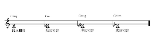 以下楽譜の解説をします。実際にピアノで和音を出して確認してください。長三和音は皆さんお馴染みですね。短三和音、増三和音、減三和音もピアノで音を出して確認してください。これらの和音も以外によく聴くでしょう。